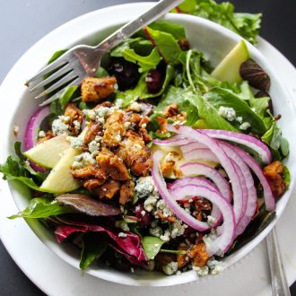 Serve it over a caesar salad. I love this caesar dressing. Toss together kale, romaine, croutons, parmesan, and that dressing. Quite a balanced meal right there.